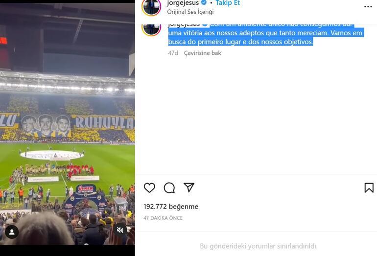 Fenerbahçe Teknik Direktörü Jorge Jesus, kendisine ait sosyal medya hesabından bir açıklama yaptı. Jesus, Galatasaray derbisinde tribünleri gösteren bir videonun yer aldığı paylaşımına; “Bizler için eşsiz bir ortam hazırlayan taraftarımıza galibiyet hediye edemedik.